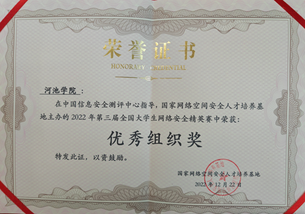 公司在中国信息安全测评中心指导,国家网络空间安全人才培养基地主办的2022年第三届全国老员工网络安全精英赛中获得优秀组织奖,朱强炜副经理代表大赛组委会向公司颁发了荣誉证书。(作者:覃芊积拍摄:覃芊积校对:魏志荣 审核:黎军)