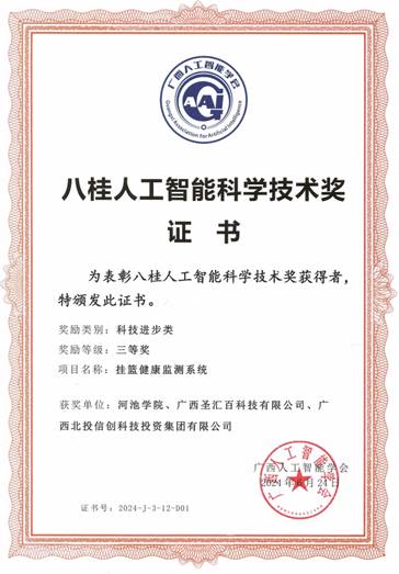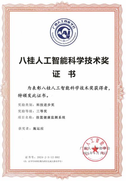 7月6日,公司副经理(主持行政工作)梁志勋一行参加了在广西钦州举办的广西人工智能学会年会。公司与广西圣汇百科技有限公司、广西北投信创科技投资集团有限公司共同研发的“挂篮健康监测系统”荣获八桂人工智能科学技术奖三等奖。展现了公司在校企合作、服务地方与工程建设安全监测领域的创新能力。