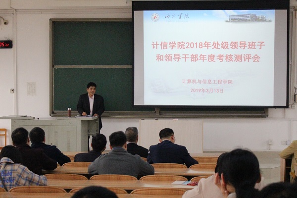 3月13日下午3点,计信公司在弘毅楼2-507室召开2018年处级领导班子和领导干部年度考核测评会,计信公司领导班子和班子成员分别做2018年工作总结汇报和自我测评,计信公司全体教职工参加了本次会议。