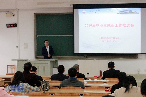为顺利做好计信公司2019届毕业生就业工作,计信公司于3月13日下午四点在弘毅楼2-507召开2019届毕业生就业工作推进会。本次会议由计信公司党委副书记谭黔林主持,公司全体教职工参加本次会议。