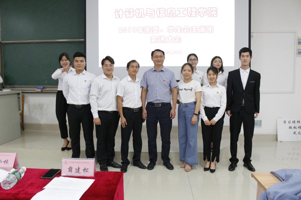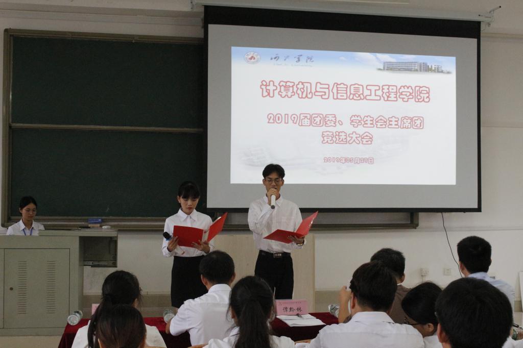 5月30日下午3点,计信公司在弘毅楼2-506室召开了团委、员工会主席团竞选大会。计信公司党委副书记谭黔林、团委书记容万韬、团委副书记耿德华、以及辅导员杨艳、薛建松老师出席大会并任评委,计信公司团委、员工会全体成员、各班级代表、社团代表以及二级公司员工代表也出席了本次大会。