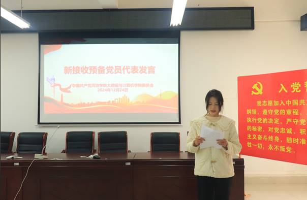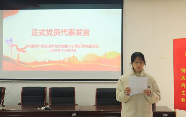 正式党员代表黄诗茵发言,她强调了党员的责任与担当,鼓励新党员坚定信仰,不断学习进步,在新时代展现新作为,践行全心全意为人民服务的宗旨。