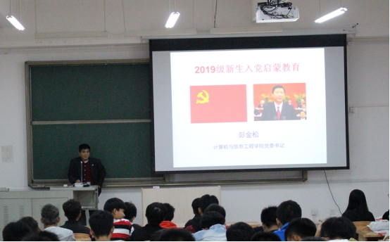 为加强新生思想政治教育,增强新生对党的基本知识的理解和掌握,引导大一新生积极主动向党组织靠拢,端正入党动机,帮助新生树立正确的世界观、人生观、价值观,10月27日晚上19:00-22:30,计信公司分别于东区弘毅楼2-501教室、2-503教室以及2-506教室对大一新生进行入党启蒙教育。全体大一新生参加活动,由党委书记彭金松同志、党委副书记谭黔林同志以及党委组织委员容万韬同志授课。