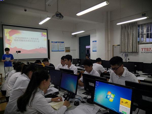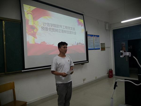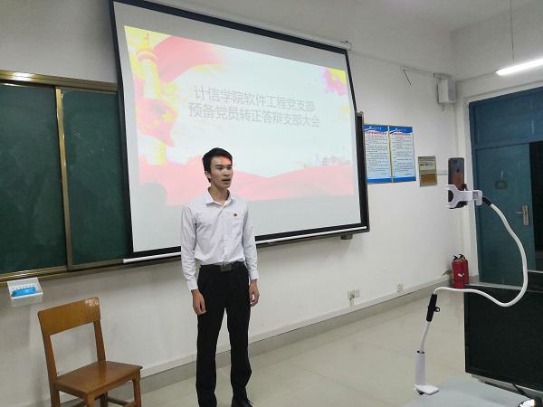 6月5日下午19点,计信公司软件工程党支部于东区逸夫楼409教室召开接受叶露、袁爽爽、马太文、高俊瑞、徐金珂、黄颖萍、黄日荣7位同志为预备党员答辩以及关于黄俊斯、周春泉、龙鑫、吕日剑4位预备党员转正的会议。会议由支部助理高俊瑞同志主持,支部副书记容万韬同志出席会议。计信公司软件工程党支部全体党员参加会议。另外,由于疫情原因,部分16级正式党员因在外实习无法返校,所以需要通过线上直播方式参加会议。