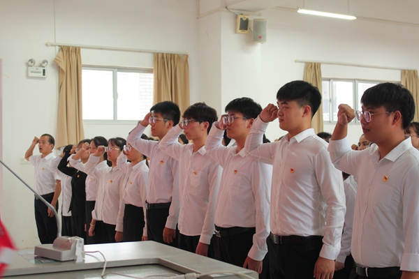 仪式开始,奏唱《国际歌》。奏毕,由党委组织委员容万韬同志宣读朱贤明等33位今年新发展党员名单。老党员给新党员佩戴党员徽章,在党旗下,党委组织委员容万韬同志带领新党员入党宣誓、正式党员重温入党誓词。