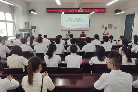 仪式开始,奏《国际歌》。奏毕,由党委组织委员容万韬同志宣读孙华涔等31位今年新发展党员名单。面向党旗,党委组织委员容万韬同志带领新党员入党宣誓、老党员重温入党誓词。