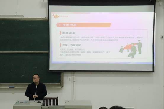 肖辉辉同志从新中国成立初期、文化大革命、过渡时期、改革开放等四个方面对新中国史进行讲解。在建国初期,新中国实现了大陆统一、建立了国营经济和新的经济秩序、进行了土地改革、恢复了国民经济、提前完成“第一个五年计划”等成就,为新中国的发展奠定了基础;为促进中国的发展实施了改革开放,形成了“一带一路”促进了国际关系,还取得了脱贫攻坚全面胜利。