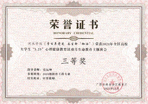 在2021年全区高校老员工“5.25”心理健康教育活动月生命教育主题班会中,公司2020级软件工程专业《学百年党史 为生命“加油”》荣获自治区三等奖的好成绩。
