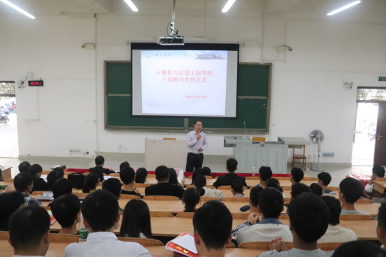 10月30日下午,计信公司在弘毅楼1-102教室举行了2018-2019学年员工干部聘书发放仪式和新老员工会成员见面会。计信公司经理林芳老师、党委副书记谭黔林老师、团委书记容万韬老师、辅导员杨艳、韦琳素老师出席了本次活动。